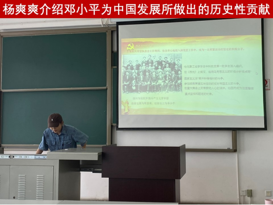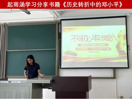 会议伊始,起雨涵同学从“建立人生观”、“加入共产党”两个方面介绍了书籍《历史转折中的邓小平》的前半部分内容,带领支部党员回顾了邓小平在人生观形成阶段接受革命思想,加入共产党的经历。随后,杨爽爽同学从“献身共产主义”和“初心不改”两个方面介绍了书籍《历史转折中的邓小平》的后半部分内容。