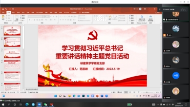 为不断提高党员同志自身综合素质,助力学生党支部建设。2022年5月19日,研建筑学学硕党支部召开线上组织生活会,开展“主题党日——学习贯彻习近平总书记重要讲话精神”活动。活动由党支部赵夺同志主持,支部党员、预备党员及部分入党积极分子参与。
