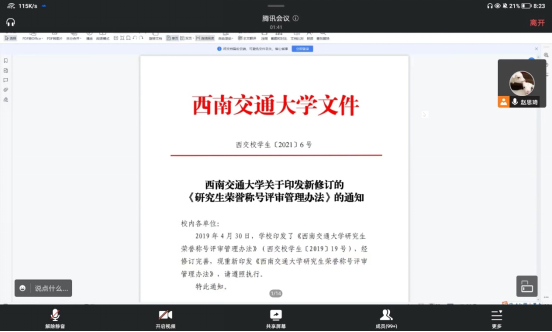 学术道德规范》进行了学习,紧接着对本学期组织开展2021-2022学年研究生荣誉称号评审工作进行了说明,从评选条件、评选程序和注意事项等方面进行了阐述,强调评优过程应本着“规范、公平、公正、公开”的原则,杜绝在评优过程中存在弄虚作假、学术不端行为,把握重要的时间节点,规范填写并及时提交申请材料。目前多地再次出现疫情,赵思琦老师强调,本次评选也将结合学生疫情防控期间的综合表现,对学生(班级)提交的申请材料及评选条件进行审核,对同学们存在疑问的地方,进行了重点解答。