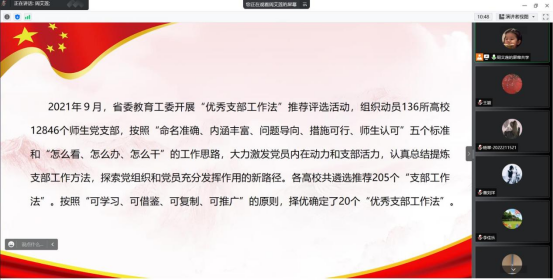 为加强党支部标准化、规范化建设,不断提高党支部建设质量,9月22日14:30,研城乡规划党支部在线上召开“学习四川省高校优秀支部工作法”组织生活会。本次会议以集体学习为主,交流讨论和个人自学相结合形式开展,由周艾莲同志主持。