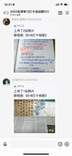 2022年9月18日,为期7天的以“学”战疫,不负青春——七天自律学习打卡活动圆满结束。本次活动共吸引20余名建院学子热情参与,累计打卡150余次。同学们以论文笔记、读书笔记、艺术创作等不同形式进行学习打卡,活动群内学习气氛高涨,成果颇丰。