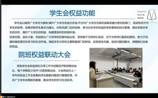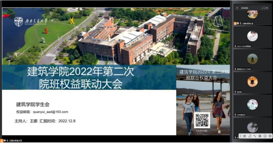 2022年第二次院班权益大会于2022年12月8日下午16点通过线上腾讯会议的方式进行。本次大会由学生会权益部部长王娜同学主持,邀请校学生会权益实践部成员,学生会主席团成员盛雨帆、朱泓霖同学,学生会权益部成员,19级、20级、21级和22级各班权益生活委员参与会议。