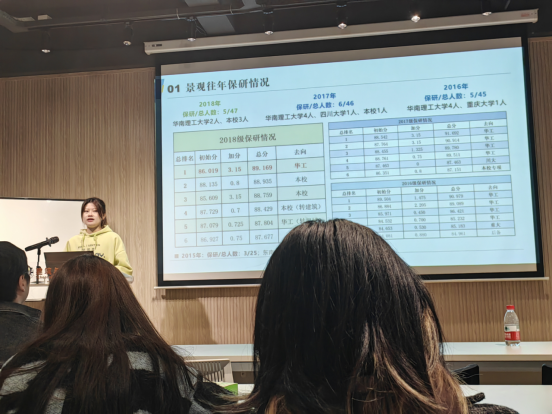 此次活动主题为保研分享,班级联合会和就业服务中心邀请了徐宇飞、吴爱千、张润旋、夏姿彤四位在各自专业成功保研的优秀同学进行就保研相关的学院政策解读、阶段规划、个人经验等内容分享。