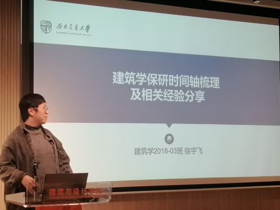 分享会上,徐宇飞同学与大家分享了他的个人保研经验,为大家讲解了建筑学专业保研所需的各阶段准备,并列出时间线,使参会同学对保研流程有了更加全面的了解;吴爱千同学为参会者解读了城乡规划专业的保研政策,并细致介绍了不同高校的夏令营特色及所应做的相应准备;风景园林2018-01班的张润旋同学则为大家梳理了风景园林往年保研的概况,并分享了其个人保研经验,为低年级同学提供了个人建议;来自公共艺术专业的夏姿彤同学则从个人经历出发,更多地为大家介绍了跨专业学习、保研以及竞赛相关信息,为大家展示了她的部分作品以及运用个人优劣的经验。四位同学诚心准备,细心介绍,精心分享,参会同学受益匪浅