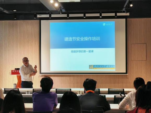 韩君伟老师担任主讲嘉宾,以“搭建梦想第一课”为主题,对本次建造节通识组以及参加建造的其他同学进行安全培训教育工作。