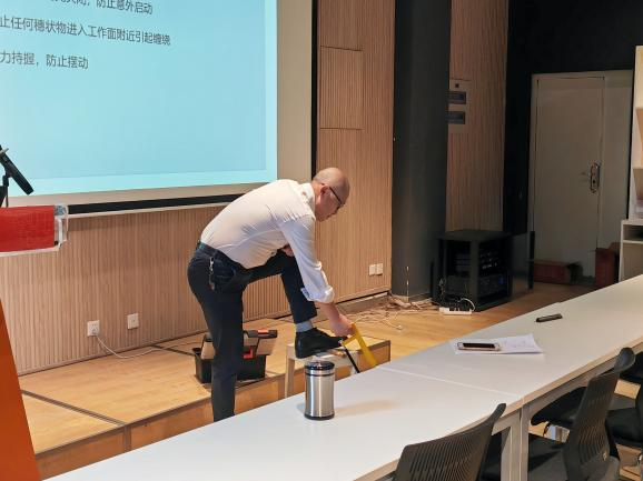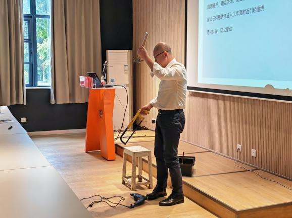 会上,韩老师首先强调了正确用电的重要性,并一一讲解了用电的正确操作以及错误示范。对于工具的使用,韩老师以电钻、木锯、锤头等具有一定危险性的工具为例,并亲身演示这些工具使用的正确姿势,同时结合了以往同学们错误并危险的操作行为,让在场同学们更能感受到正确使用工具的重要性。
