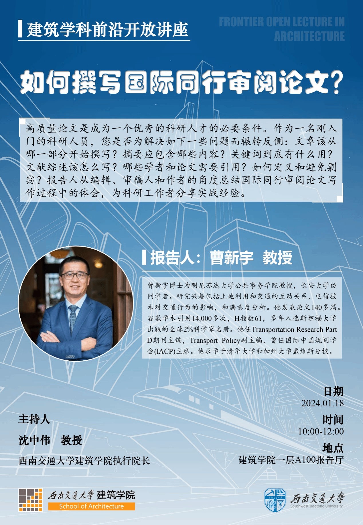曹新宇博士为明尼苏达大学公共事务学院教授,长安大学访问学者。研究方向包括土地利用和交通的互动关系,电信技术对交通行为的影响,和满意度分析。他发表论文140多篇。谷歌学术引用14,000多次,H指数61,多年入选斯坦福大学出版的全球2%科学家名册。他任Transportation Research Part D期刊主编,Transport Policy副主编,曾任国际中国规划学会(IACP)主席。他求学于清华大学和加州大学戴维斯分校。