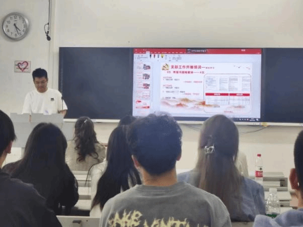 会议第二项由张驰同志对支部2022-2023年党建工作进行总结。在过去一年的支部建设中,支部做到了组织生活制度化;信息管理电子化;发展党员规范化;学习教育常态化。2022年9月至今,支部共开展21次党组织活动,活动内容丰富,涉及专题学习、实践学习、支部共建等多个方面。同时张驰同志也提到,在过去的一年当中,支部建设也反应了不少问题,例如党建考核工作机制不够健全、合作平台不够多元、学生党员党性修养有待提高、创新能力有待发掘等。通过讲述,支部各成员充分意识到支部建设的重要性,并对支部未来发展方向有了进一步更明确的认识。