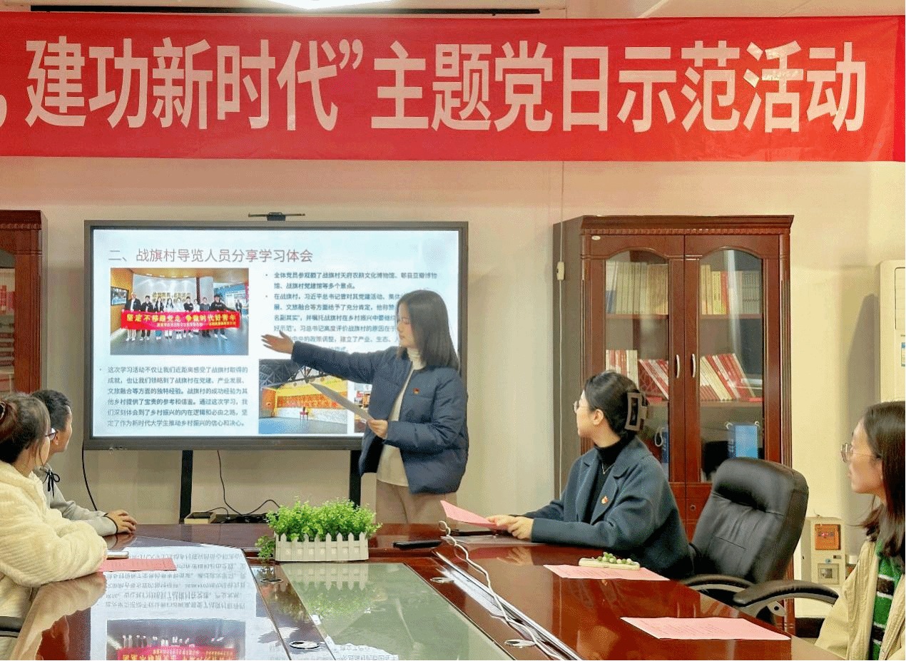 战旗村导览人员、支部组织委员庞淇文同志分享了在战旗村参观活动中的导览体验。她再次讲述了战旗村的建村历程和该村在我们党的发展过程中的坚强作为,介绍了战旗村在党建、产业发展、文旅融合等方面的独特经验。与会成员对战旗村都有了更加深刻的了解,坚定了支部成员作为新时代大学生推动乡村振兴的信心和决心。