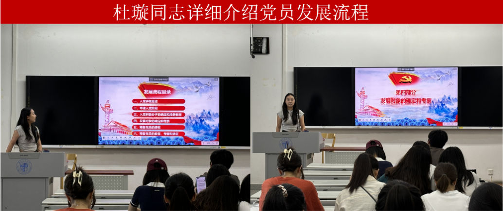 会议第二环节是关于党员发展流程的介绍和解读。党支部书记杜璇从党的章程和《中国共产党发展党员工作细则》出发,详细介绍了从提交入党申请书、确定入党积极分子、发展对象确定、接收预备党员到预备党员的考察与转正的全过程。会议中杜璇同志强调,党员发展过程中,要关注申请人的思想政治素质,还要注重其在社会生活和工作中的表现。杜璇同志对党员发展流程的解读让在场的党员们对党员发展的严谨性有了更深刻的理解,也进一步增强了新党员们对党组织的认同感和归属感。