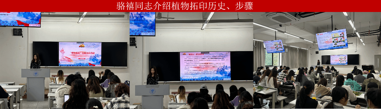 在理论学习后,活动进入了植物拓印的实践环节。党员们在骆禧同志的指导下,了解到植物拓印的历史和发展背景。从宋代文人以叶片为材料进行文房四宝的拓印制作,到这一技艺被广泛应用于植物学研究和艺术创作中,植物拓印不仅是手工展现的一种形式,更是一种文化的传承。通过拓印植物的形态特征,党员们可以更加直观地感受风景园林专业背景下最真实的自然洗礼,更能在自然中体悟文化,在文化中激发爱国热情。