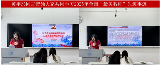 在观看视频后,黄宇彤同志带领大家一起学习2025年全国“最美教师”先进事迹。她介绍了24位“最美教师”和保定学院毕业生赴疆任教群体的感人故事,带领大家深刻体会他们牢记为党育人、为国育才的初心使命,用行动落实立德树人的生动实践。大家边学边记,边思边议,深受感染,纷纷表示要以“最美教师”为榜样,学习他们乐教善教、因材施教的教育情怀,学习他们瞄准国家战略需求、勇攀科研高峰的奋斗精神,学习他们扎根基层、甘于奉献的高尚品格。