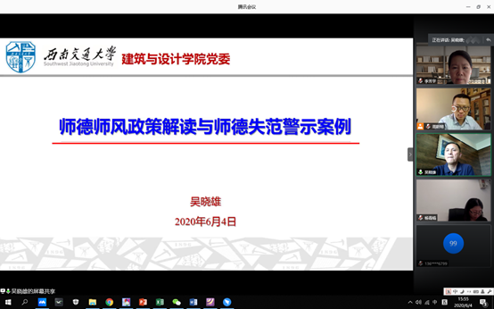 6月4日,工业设计系党支部和风景园林系党支部,联合组织了本周的政治理论学习。本次学习通过在线会议方式进行。院党委吴晓雄书记参加了本次学习,为两系全体教师做了题为《师德师风政策解读与师德失范警示案例》的主题学习报告。吴书记深度解读了党中央、教育部关于师德师风的各项政策,深入介绍了我校关于师德师风建设的各项规定,结合实际案例,生动分析了师德失范的典型表现,帮助老师们更加深刻地理解恪守师德师风应坚守的界限,勉励老师们积极追求卓越,保持清醒理性,模范践行教师行为准则,做学生的良师益友。