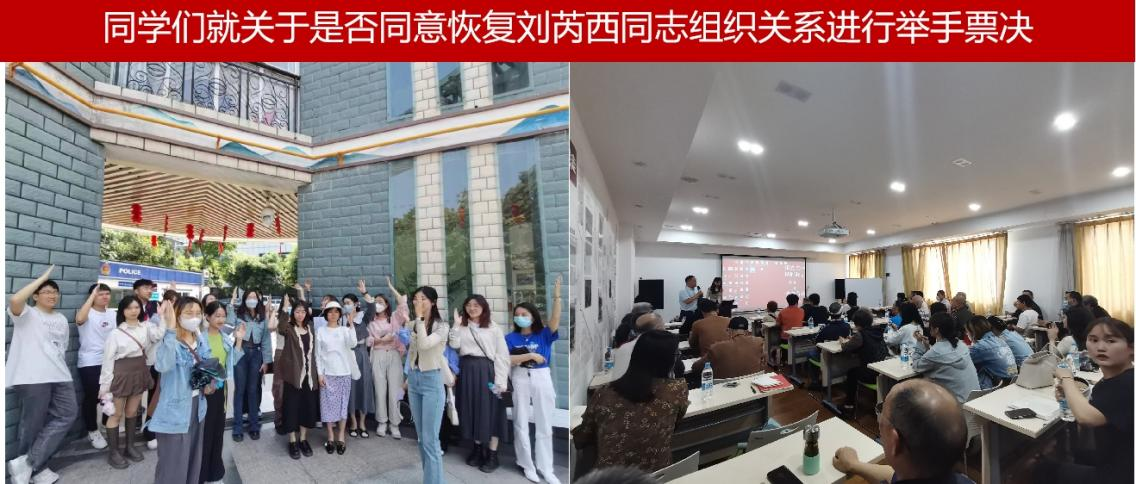 最后,支部召开支部党员大会,讨论了关于是否同意恢复刘芮西同志组织关系。刘芮西同志思想汇报,材料齐全,反思深刻。对刘芮西同志提出恢复党组织生活的情况进行讨论,会议应到40人,实到31 人,31票同意, 0票反对,0票弃权,同意人数超过应到会人数半数,研风景园林党支部通过刘芮西同志恢复党组织生活的申请。